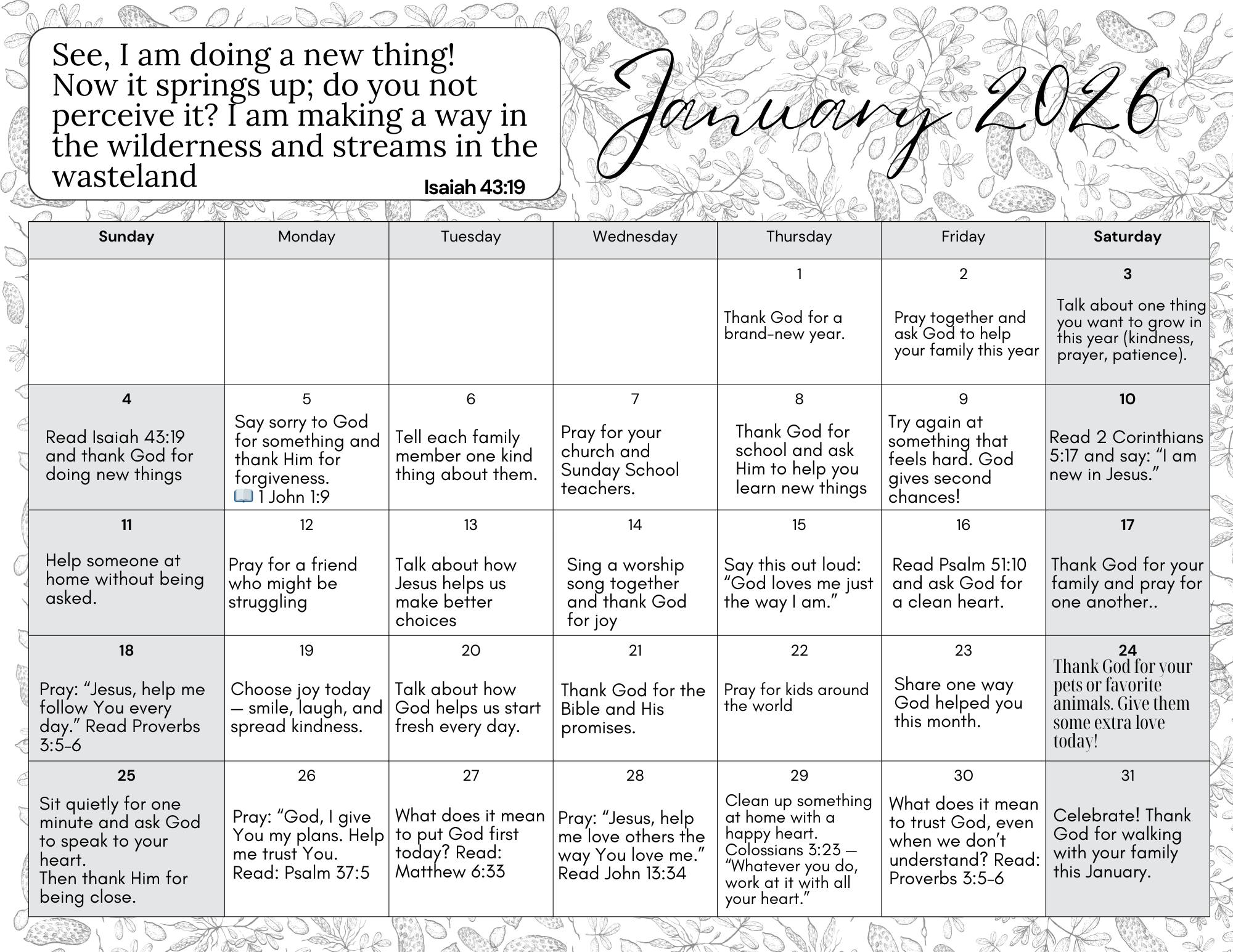 January Reading and Prayer Calendar